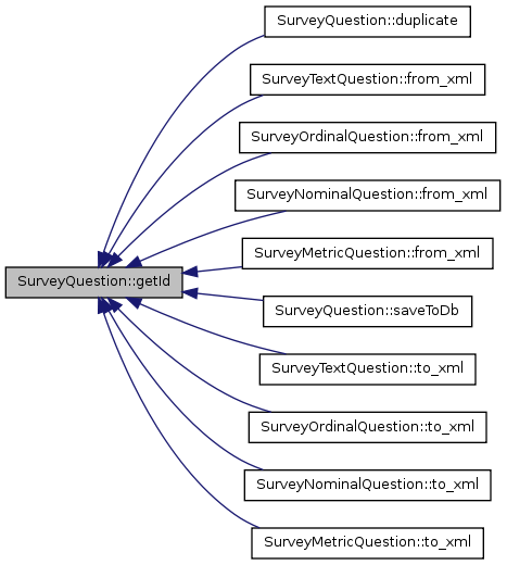 Referenced by SurveyTextQuestion::loadFromDb(), SurveyOrdinalQuestion::loadFromDb(), SurveyNominalQuestion::loadFromDb(), SurveyMetricQuestion::loadFromDb(), setId(), and setSurveyId().