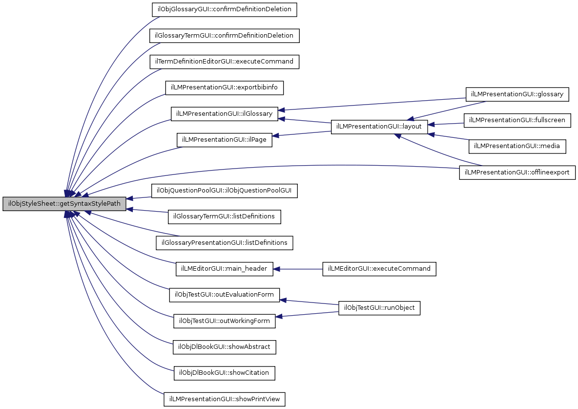 Here is the caller graph for this function:| ilObjStyleSheet::getSyntaxStylePath | ( | ) |