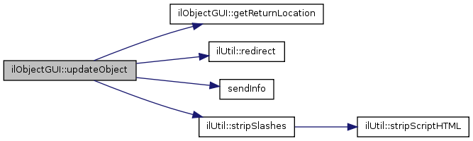 Here is the call graph for this function:| ilObjectGUI::updateObject | ( | ) |