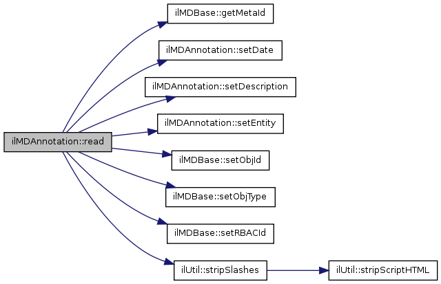 Here is the call graph for this function:| ilMDAnnotation::read | ( | ) |