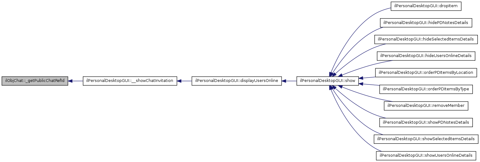 Here is the call graph for this function:| ilObjChat::_getPublicChatRefId | ( | ) |