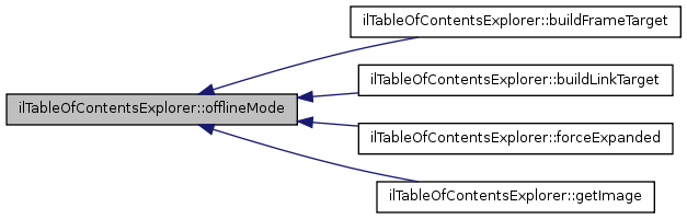 Here is the call graph for this function:| ilTableOfContentsExplorer::offlineMode | ( | ) |