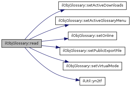 Here is the call graph for this function:| ilObjGlossary::read | ( | ) |