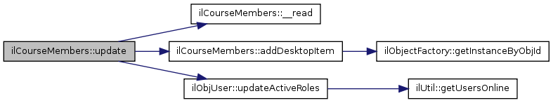 Here is the call graph for this function:| ilCourseMembers::update | ( | $ | a_usr_id, | |