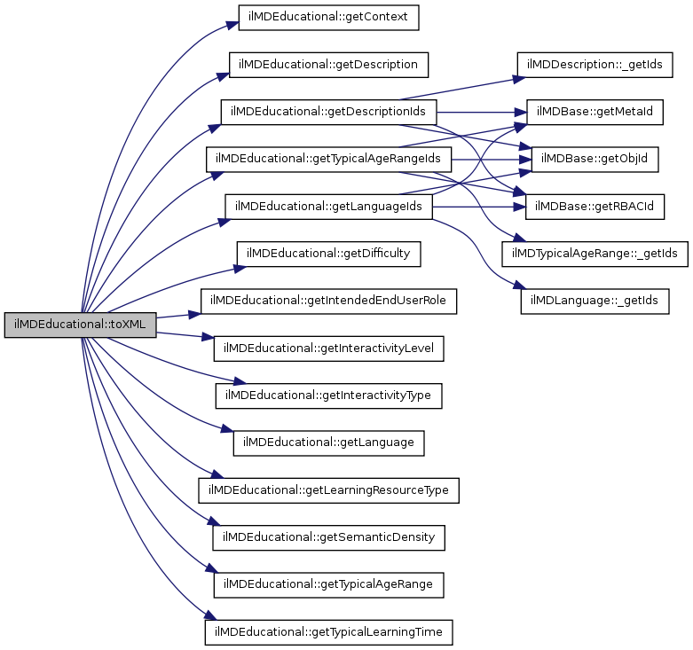 Here is the call graph for this function:| ilMDEducational::toXML | ( | &$ | writer | ) |