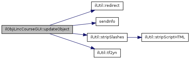 Here is the call graph for this function:| ilObjiLincCourseGUI::updateObject | ( | ) |