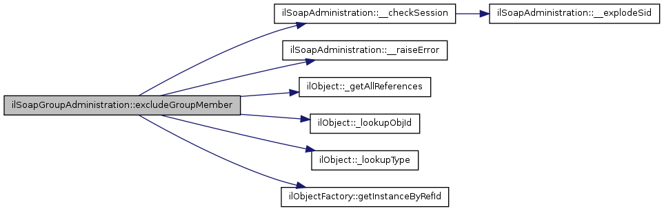 Here is the call graph for this function:| ilSoapGroupAdministration::excludeGroupMember | ( | $ | sid, | |