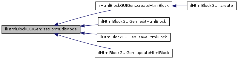 Here is the call graph for this function:| ilHtmlBlockGUIGen::setFormEditMode | ( | $ | a_form_edit_mode | ) |
