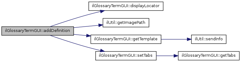 Here is the call graph for this function:| ilGlossaryTermGUI::addDefinition | ( | ) |