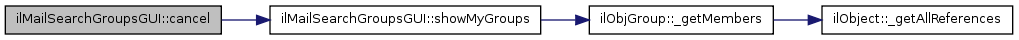 Here is the call graph for this function:| ilMailSearchGroupsGUI::cancel | ( | ) |
