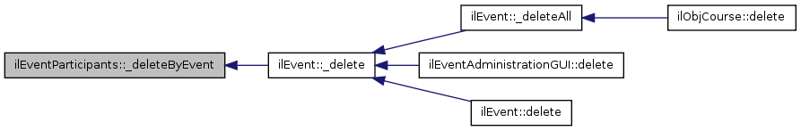 Here is the caller graph for this function:| ilEventParticipants::_deleteByEvent | ( | $ | a_event_id | ) |