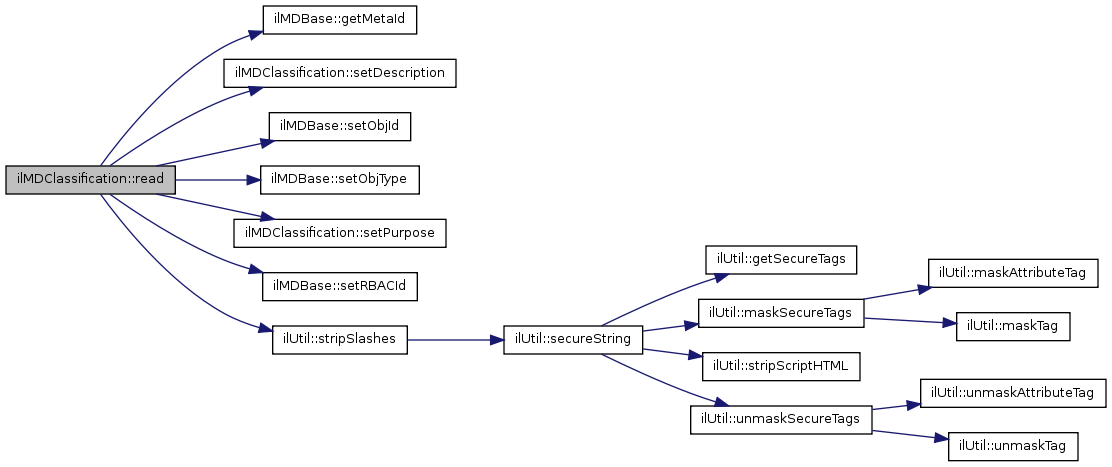 Here is the call graph for this function:| ilMDClassification::read | ( | ) |
