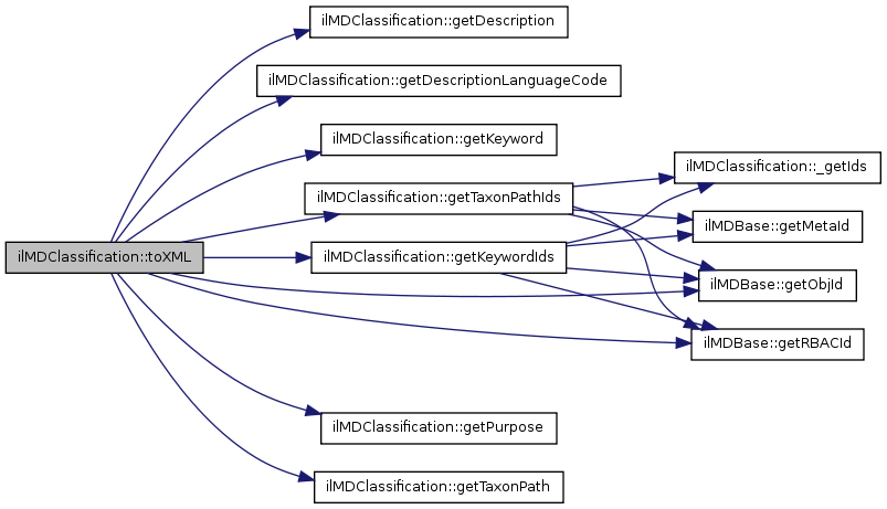 Here is the call graph for this function:| ilMDClassification::toXML | ( | &$ | writer | ) |