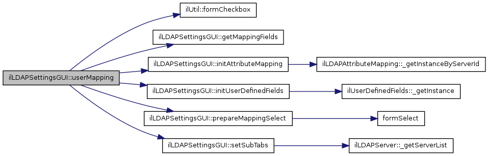 Here is the call graph for this function:| ilLDAPSettingsGUI::userMapping | ( | $ | a_show_defaults = false |