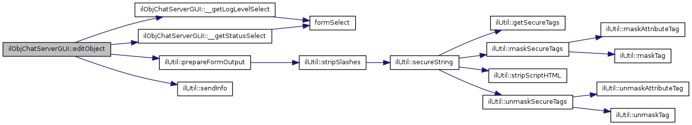 Here is the call graph for this function:| ilObjChatServerGUI::editObject | ( | ) |