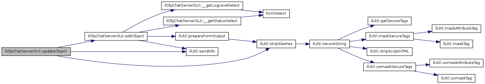 Here is the call graph for this function:| ilObjChatServerGUI::updateObject | ( | ) |