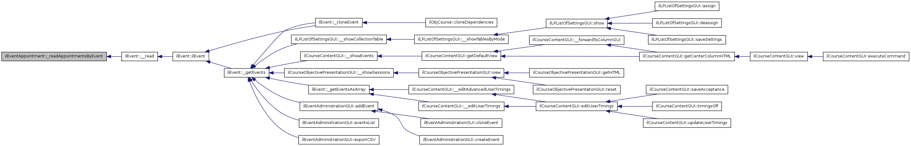 Here is the caller graph for this function:| & ilEventAppointment::_readAppointmentsByEvent | ( | $ | a_event_id | ) |