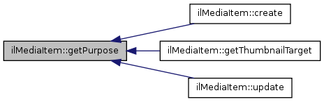 Here is the call graph for this function:| ilMediaItem::setPurpose | ( | $ | a_purpose | ) |