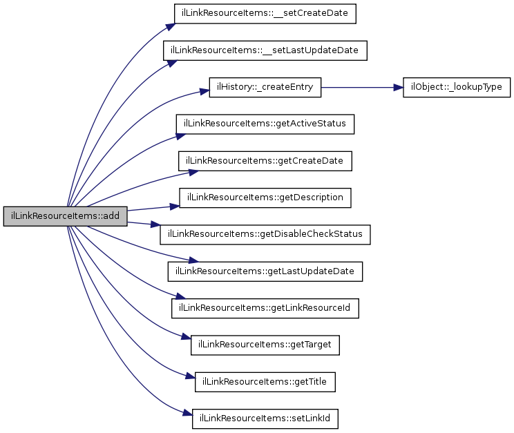 References __setCreateDate(), __setLastUpdateDate(), ilHistory::_createEntry(), getActiveStatus(), getCreateDate(), getDescription(), getDisableCheckStatus(), getLastUpdateDate(), getLinkResourceId(), getTarget(), getTitle(), and setLinkId().