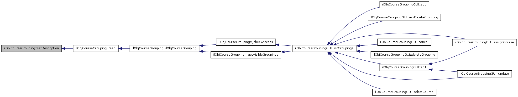 Here is the caller graph for this function:| ilObjCourseGrouping::setDescription | ( | $ | a_desc | ) |