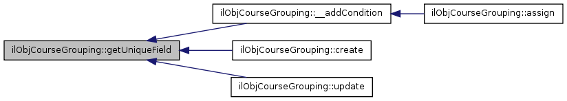 Here is the caller graph for this function:| ilObjCourseGrouping::getUniqueField | ( | ) |
