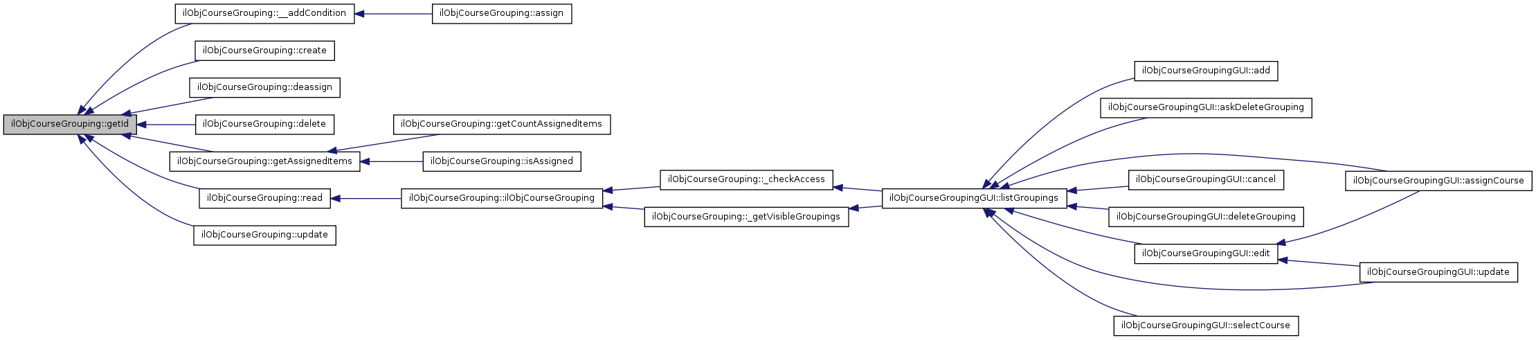 Here is the caller graph for this function:| ilObjCourseGrouping::getId | ( | ) |