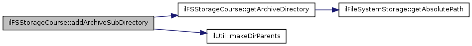 Here is the call graph for this function:| ilFSStorageCourse::addArchiveSubDirectory | ( | $ | a_name | ) |