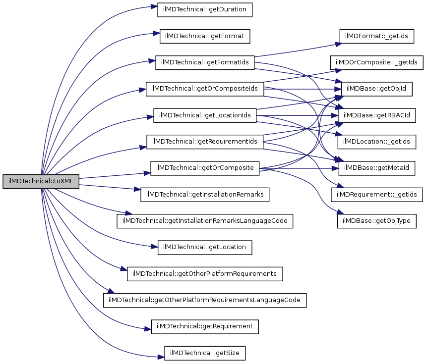Here is the call graph for this function:| ilMDTechnical::toXML | ( | &$ | writer | ) |