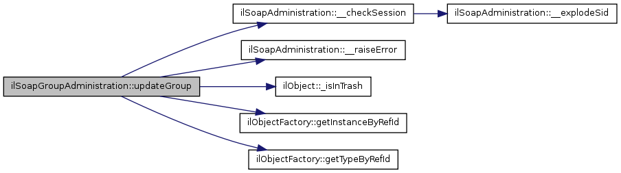 Here is the call graph for this function:| ilSoapGroupAdministration::updateGroup | ( | $ | sid, | |