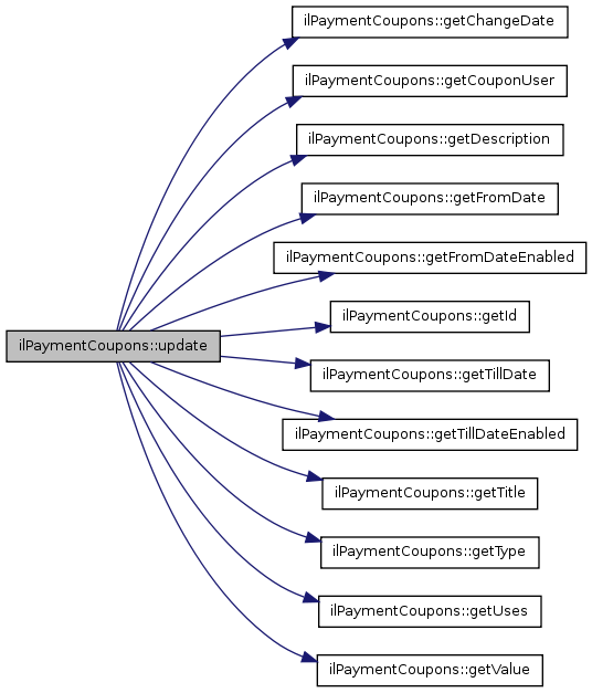Here is the call graph for this function:| ilPaymentCoupons::update | ( | ) |