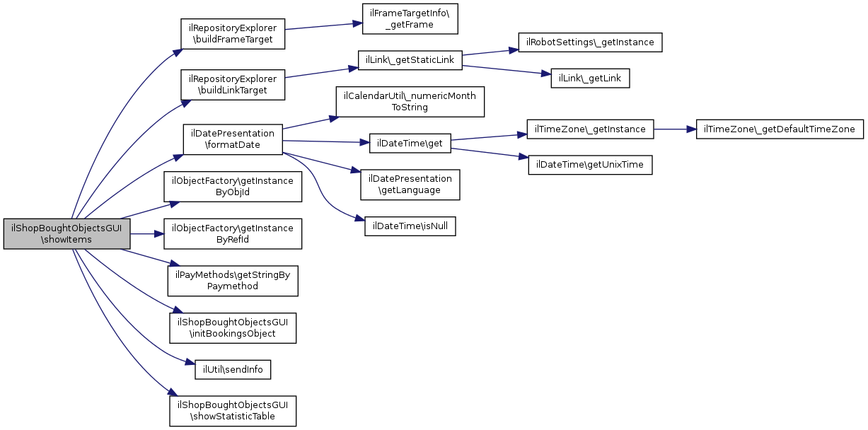 References ilRepositoryExplorer\buildFrameTarget(), ilRepositoryExplorer\buildLinkTarget(), ilDatePresentation\formatDate(), ilObjectFactory\getInstanceByObjId(), ilObjectFactory\getInstanceByRefId(), ilPayMethods\getStringByPaymethod(), IL_CAL_UNIX, initBookingsObject(), ilUtil\sendInfo(), and showStatisticTable().