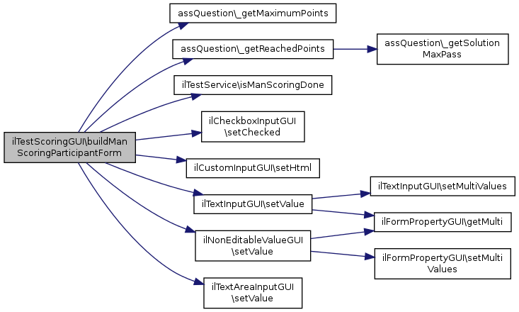 References $ilCtrl, ilTestServiceGUI\$lng, $pass, assQuestion\_getMaximumPoints(), assQuestion\_getReachedPoints(), ilTestService\isManScoringDone(), ilCheckboxInputGUI\setChecked(), ilCustomInputGUI\setHtml(), ilTextInputGUI\setValue(), ilNonEditableValueGUI\setValue(), and ilTextAreaInputGUI\setValue().