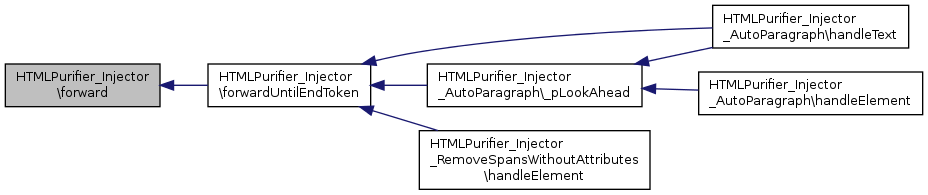 Referenced by HTMLPurifier_Injector_AutoParagraph\_pLookAhead(), HTMLPurifier_Injector_RemoveSpansWithoutAttributes\handleElement(), and HTMLPurifier_Injector_AutoParagraph\handleText().