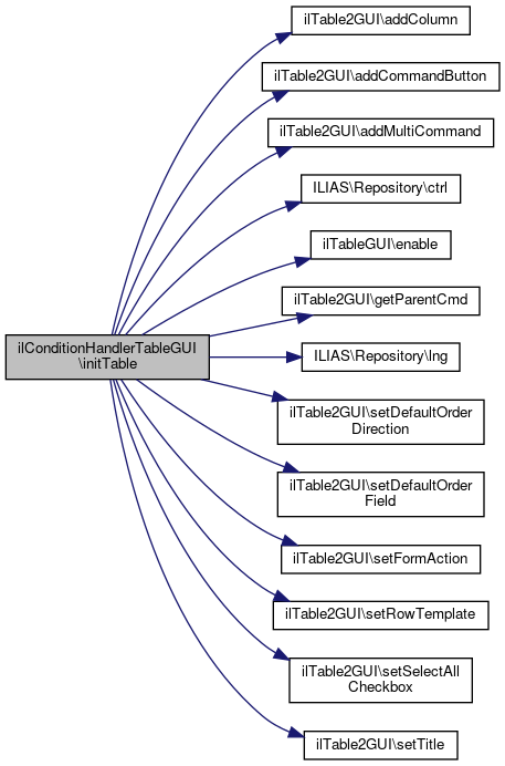 References ilTable2GUI\addColumn(), ilTable2GUI\addCommandButton(), ilTable2GUI\addMultiCommand(), ILIAS\Repository\ctrl(), ilTableGUI\enable(), ilTable2GUI\getParentCmd(), ILIAS\Repository\lng(), ilTable2GUI\setDefaultOrderDirection(), ilTable2GUI\setDefaultOrderField(), ilTable2GUI\setFormAction(), ilTable2GUI\setRowTemplate(), ilTable2GUI\setSelectAllCheckbox(), and ilTable2GUI\setTitle().