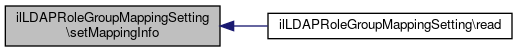 Here is the caller graph for this function:| ilLDAPRoleGroupMappingSetting::getMappingInfo | ( | ) |