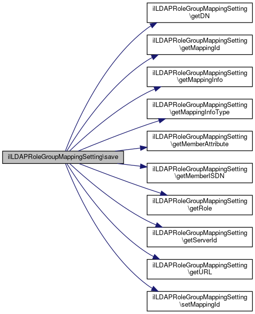 Here is the call graph for this function:| ilLDAPRoleGroupMappingSetting::save | ( | ) |