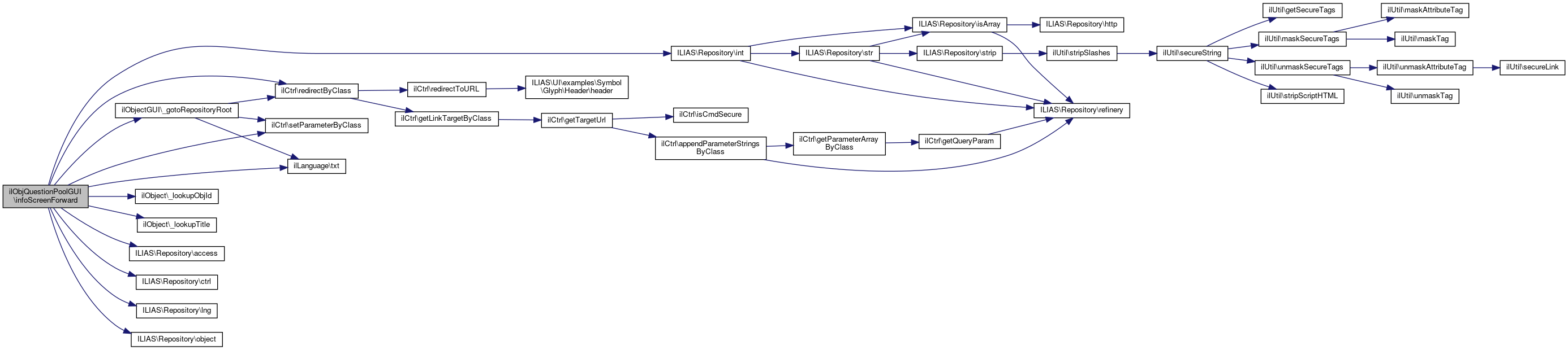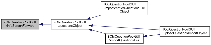 Here is the call graph for this function:| ilObjQuestionPoolGUI::infoScreenForward | ( | ) |