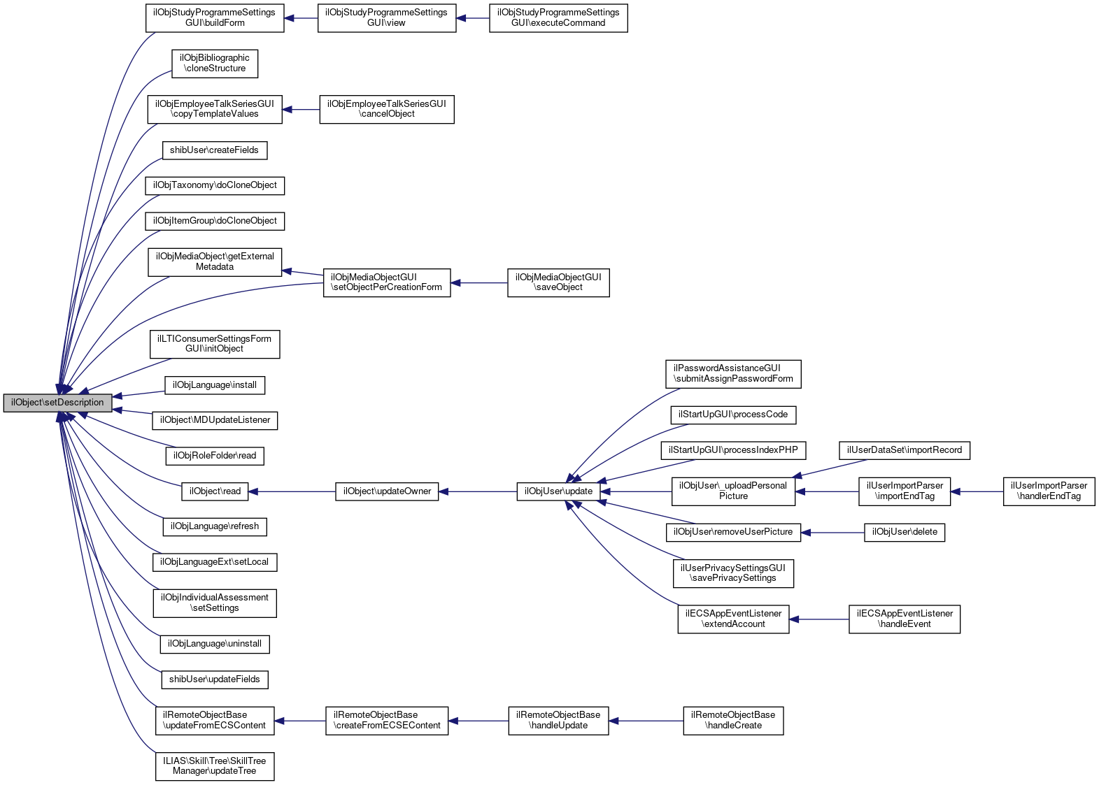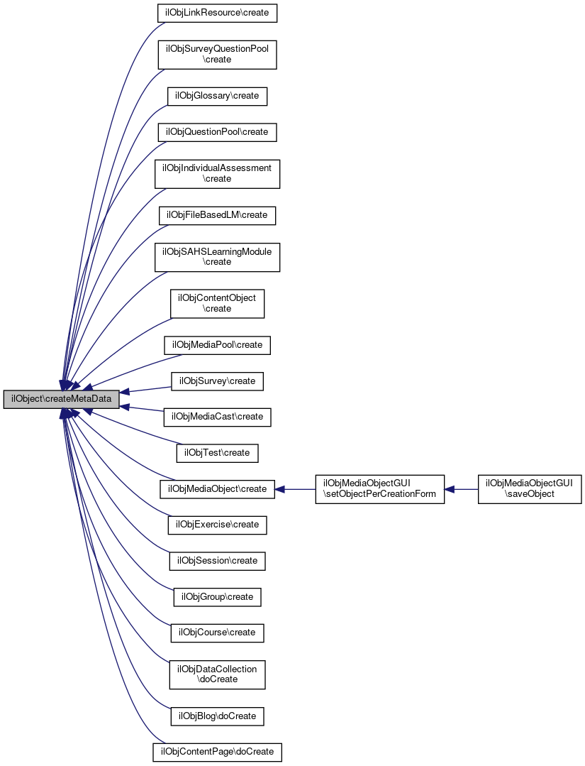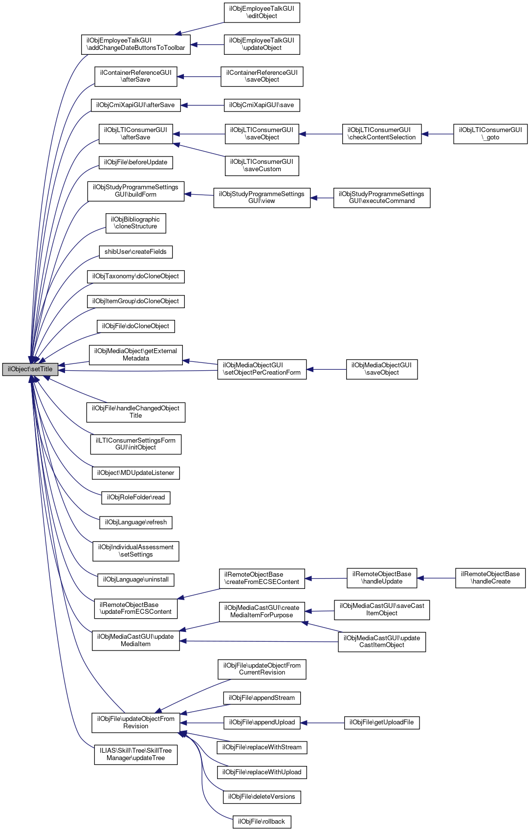 Referenced by ilObjEmployeeTalkGUI\addChangeDateButtonsToToolbar(), ilContainerReferenceGUI\afterSave(), ilObjCmiXapiGUI\afterSave(), ilObjLTIConsumerGUI\afterSave(), ilObjFile\beforeUpdate(), ilObjStudyProgrammeSettingsGUI\buildForm(), ilObjBibliographic\cloneStructure(), shibUser\createFields(), ilObjTaxonomy\doCloneObject(), ilObjItemGroup\doCloneObject(), ilObjFile\doCloneObject(), ilObjMediaObject\getExternalMetadata(), ilObjFile\handleChangedObjectTitle(), ilLTIConsumerSettingsFormGUI\initObject(), MDUpdateListener(), ilObjRoleFolder\read(), ilObjLanguage\refresh(), ilObjMediaObjectGUI\setObjectPerCreationForm(), ilObjIndividualAssessment\setSettings(), ilObjLanguage\uninstall(), ilRemoteObjectBase\updateFromECSContent(), ilObjMediaCastGUI\updateMediaItem(), ilObjFile\updateObjectFromRevision(), and ILIAS\Skill\Tree\SkillTreeManager\updateTree().