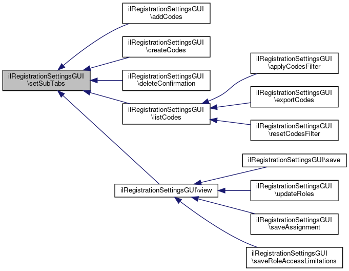 Here is the call graph for this function:| ilRegistrationSettingsGUI::setSubTabs | ( | string | $activeTab = 'registration_settings' | ) |