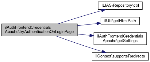 Here is the call graph for this function:| ilAuthFrontendCredentialsApache::tryAuthenticationOnLoginPage | ( | ) |
