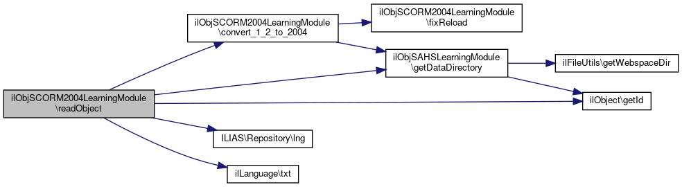 Here is the call graph for this function:| ilObjSCORM2004LearningModule::readObject | ( | ) |