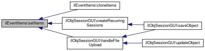 Here is the caller graph for this function:| ilEventItems::setItems | ( | array | $a_items | ) |