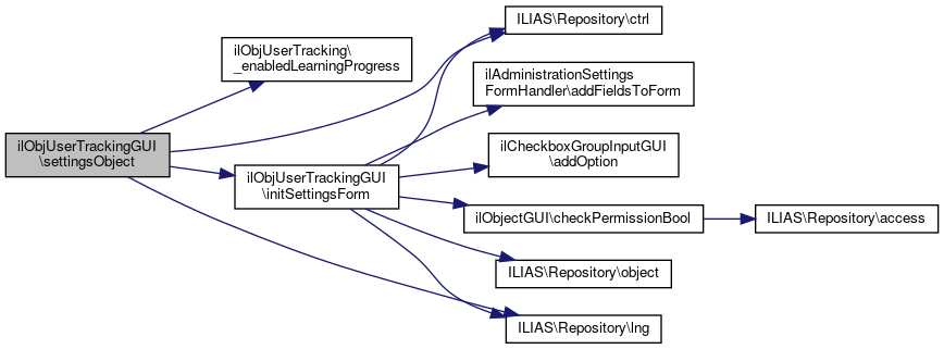 Here is the call graph for this function:| ilObjUserTrackingGUI::settingsObject | ( | ?ilPropertyFormGUI | $a_form = null | ) |