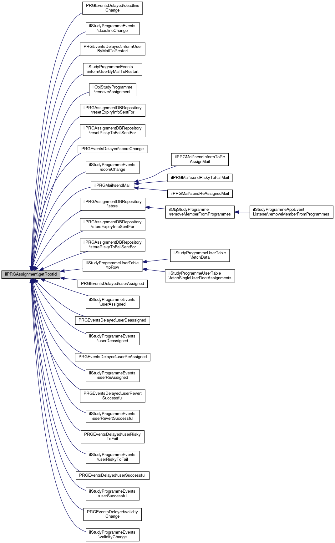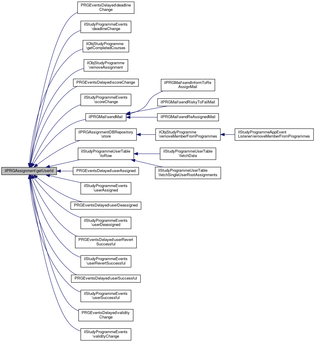 Referenced by PRGEventsDelayed\deadlineChange(), ilStudyProgrammeEvents\deadlineChange(), PRGEventsDelayed\informUserByMailToRestart(), ilStudyProgrammeEvents\informUserByMailToRestart(), ilObjStudyProgramme\removeAssignment(), ilPRGAssignmentDBRepository\resetExpiryInfoSentFor(), ilPRGAssignmentDBRepository\resetRiskyToFailSentFor(), PRGEventsDelayed\scoreChange(), ilStudyProgrammeEvents\scoreChange(), ilPRGMail\sendMail(), ilPRGAssignmentDBRepository\store(), ilPRGAssignmentDBRepository\storeExpiryInfoSentFor(), ilPRGAssignmentDBRepository\storeRiskyToFailSentFor(), ilStudyProgrammeUserTable\toRow(), PRGEventsDelayed\userAssigned(), ilStudyProgrammeEvents\userAssigned(), PRGEventsDelayed\userDeassigned(), ilStudyProgrammeEvents\userDeassigned(), PRGEventsDelayed\userReAssigned(), ilStudyProgrammeEvents\userReAssigned(), PRGEventsDelayed\userRevertSuccessful(), ilStudyProgrammeEvents\userRevertSuccessful(), PRGEventsDelayed\userRiskyToFail(), ilStudyProgrammeEvents\userRiskyToFail(), PRGEventsDelayed\userSuccessful(), ilStudyProgrammeEvents\userSuccessful(), PRGEventsDelayed\validityChange(), and ilStudyProgrammeEvents\validityChange().