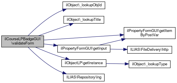 Here is the call graph for this function:| ilCourseLPBadgeGUI::validateForm | ( | ilPropertyFormGUI | $a_form | ) |