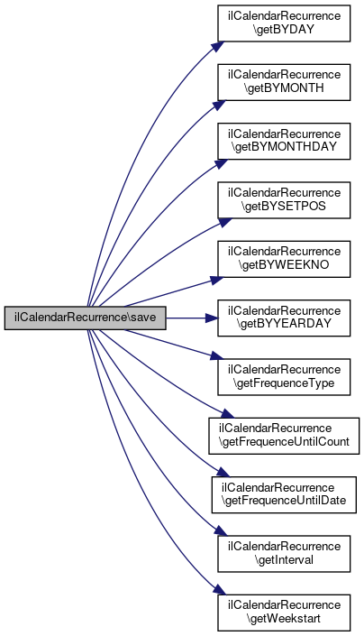 Here is the call graph for this function:| ilCalendarRecurrence::save | ( | ) |