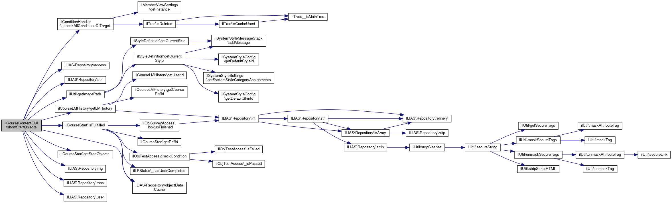 Here is the call graph for this function:| ilCourseContentGUI::showStartObjects | ( | ilCourseStart | $start_obj | ) |