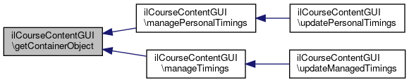 Here is the call graph for this function:| ilCourseContentGUI::getContainerObject | ( | ) |