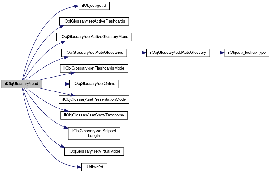 Here is the caller graph for this function:| ilObjGlossary::read | ( | ) |
