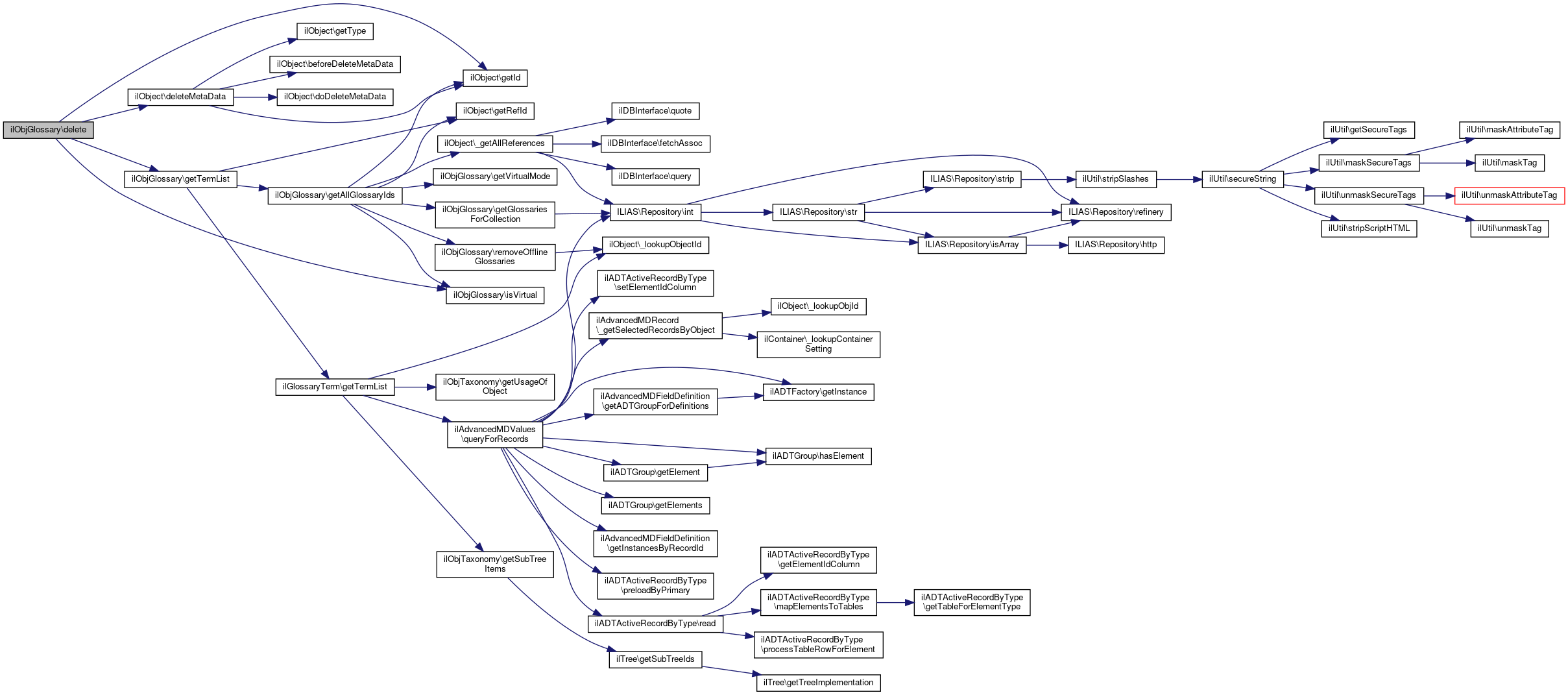 Here is the call graph for this function:| ilObjGlossary::removeGlossaryFromCollection | ( | int | $glo_id | ) |
